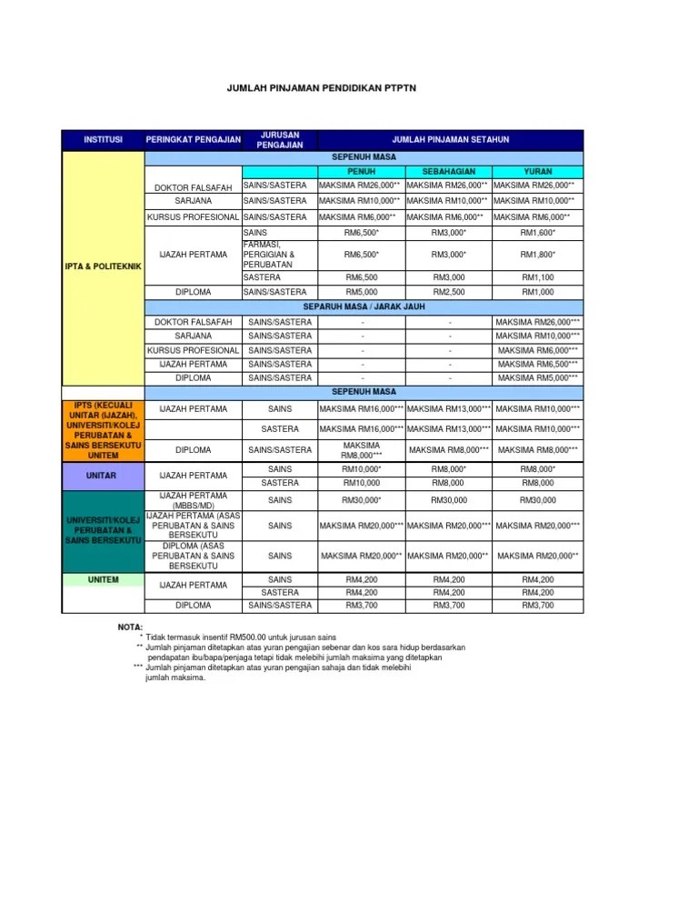 Jumlah pinjaman ptptn adalah ditentukan berdasarkan status ibu. "pada masa yang sama, kementerian juga bersetuju untuk meluaskan pemberian wang pendahuluan pinjaman ptptn kepada pelajar ipts daripada . Jadual jumlah pembiayaan ptptn mengikut peringkat pengajian. Jadual jumlah pembiayaan ptptn mengikut peringkat pengajian. Senarai jumlah pinjaman ptptn untuk pelajar sepenuh masa atau separuh masa yang bakal melanjutkan pengajian di ipts, ipts, politeknik. Pembiayaan untuk separuh masa ipts disediakan bagi universiti terbuka malaysia, .